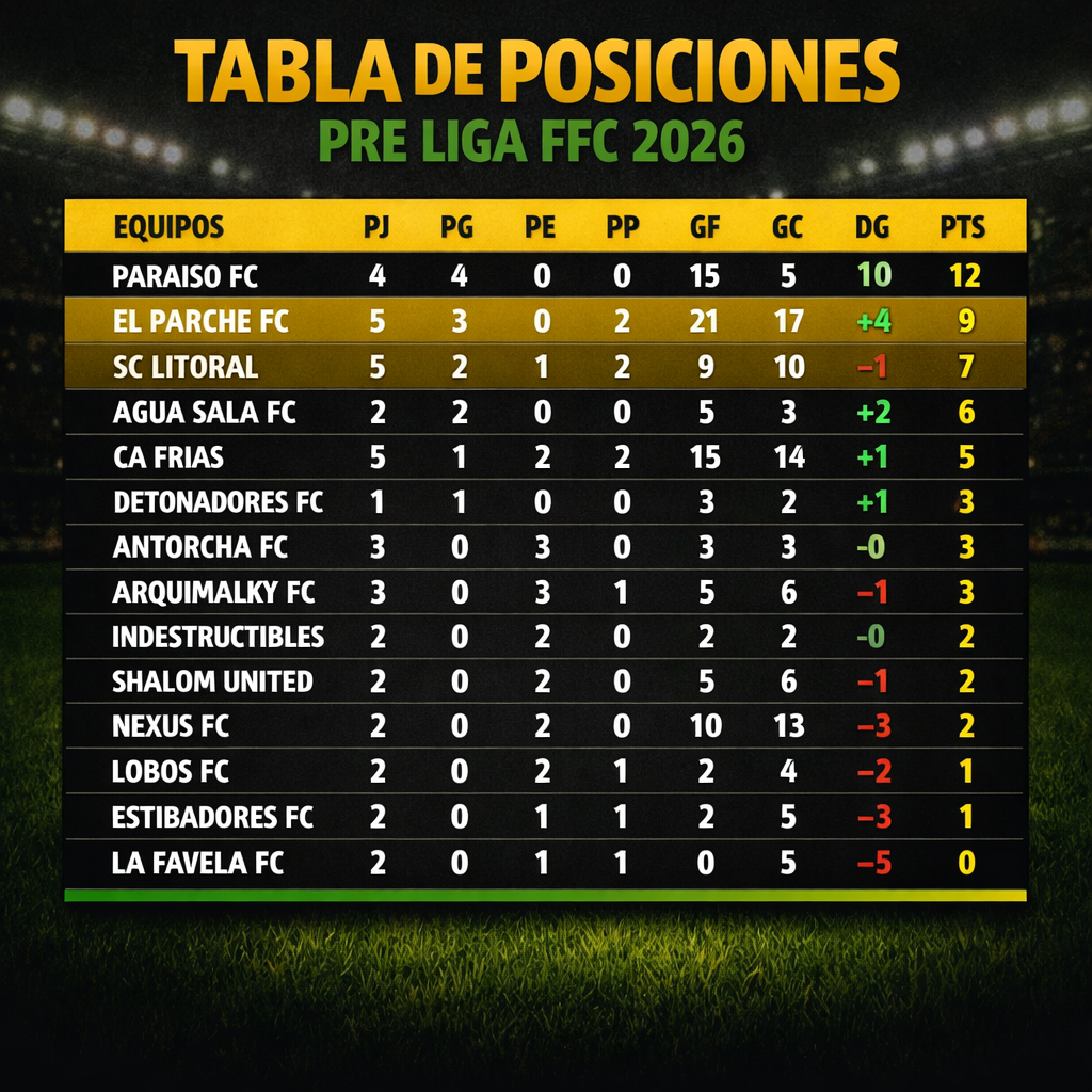 Con este resultado, los clubes ajustan sus posiciones en una clasificación que continúa siendo dominada por Paraíso FC, mientras El Parche FC y SC Litoral mantienen una presión constante en la parte alta. La actualización de posiciones tras este encuentro es clave para los aficionados que siguen de cerca el avance de los equipos en su camino hacia la Liga FFC, especialmente en una fase donde cada punto puede marcar diferencias importantes.